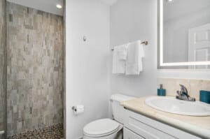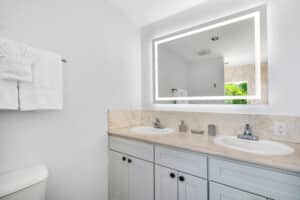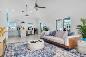 Upon entering the villa, you are welcomed into a spacious open-plan living area adorned with high ceilings and cool ceramic tile floors. The living room, with its comfortable chic seating, is the ideal spot for relaxation or entertaining guests, all while enjoying unobstructed views of the lake, pool and pool deck through the 3 large sliding glass doors.