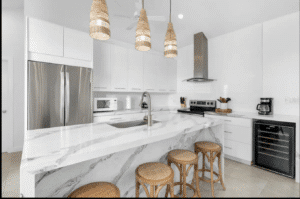 The entrance to the larger 2-bedroom pod is an accordion style door that spans the entire living room and kitchen area. The living room and kitchen are awash with natural light and includes ample seating, a 65” flatscreen TV and a fully equipped open concept kitchen. Opening the accordion style doors allows guests to move seamlessly from the living room and fully equipped kitchen to the outdoor dining and expanded covered living space.